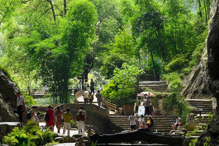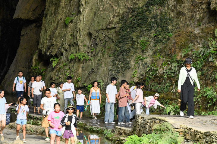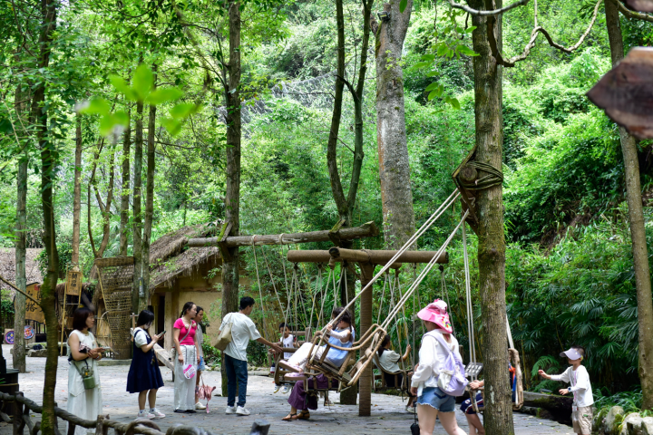8月2日,游客和市民在酉阳桃花源景区游玩,乐享清凉。