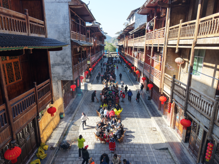 11月26日中午,随着“大地欢歌·乡约四季”2025年全国冬季“村晚”示范展示系列活动深入推进,酉水河镇后溪村在千年吊脚楼长廊摆下百米长桌,举办“赏民俗、吃刨汤”特色活动,400余名食客共享热气腾腾的“刨猪汤”,提前点燃土家年味。
